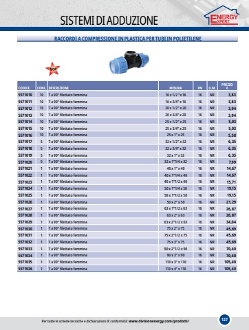 127SISTEMI DI ADDUZIONERACCORDI A COMPRESSIONE IN PLASTICA PER TUBI IN POLIETILENECODICECONF.DESCRIZIONEMISURAPNU.M.PREZZO%u20ac557101010T a 90%u00b0 filettato femmina16 x 1/2 %u201dx 1616NR3,83557101110T a 90%u00b0 filettato femmina16 x 3/4%u201d x 1616NR3,83557101210T a 90%u00b0 filettato femmina20 x 1/2%u201d x 2016NR3,94557101310T a 90%u00b0 filettato femmina20 x 3/4%u201d x 2016NR3,94557101410T a 90%u00b0 filettato femmina25 x 1/2%u201d x 2516NR5,03557101510T a 90%u00b0 filettato femmina25 x 3/4%u201d x 2516NR5,03557101610T a 90%u00b0 filettato femmina25 x 1%u201d x 2516NR5,5855710175T a 90%u00b0 filettato femmina32 x 1/2%u201d x 3216NR6,3555710185T a 90%u00b0 filettato femmina32 x 3/4%u201d x 3216NR6,3555710195T a 90%u00b0 filettato femmina32 x 1%u201d x 3216NR6,3555710205T a 90%u00b0 filettato femmina32 x 1%u201d1/4 x 3216NR7,9955710211T a 90%u00b0 filettato femmina40 x 1%u201d x 4016NR14,6755710221T a 90%u00b0 filettato femmina40 x 1%u201d1/4 x 4016NR14,6755710231T a 90%u00b0 filettato femmina40 x 1%u201d1/2 x 4016NR15,7155710241T a 90%u00b0 filettato femmina50 x 1%u201d1/4 x 5016NR19,1555710251T a 90%u00b0 filettato femmina50 x 1%u201d1/2 x 5016NR19,1555710261T a 90%u00b0 filettato femmina50 x 2%u201d x 5016NR21,2955710271T a 90%u00b0 filettato femmina63 x 1%u201d1/2 x 6316NR26,8755710281T a 90%u00b0 filettato femmina63 x 2%u201d x 6316NR26,8755710291T a 90%u00b0 filettato femmina63 x 2%u201d1/2 x 6316NR34,0455710301T a 90%u00b0 filettato femmina75 x 2%u201d x 7516NR45,6955710311T a 90%u00b0 filettato femmina75 x 2%u201d1/2 x 7516NR45,6955710321T a 90%u00b0 filettato femmina75 x 3%u201d x 7516NR45,6955710331T a 90%u00b0 filettato femmina90 x 2%u201d1/2 x 9016NR70,4055710341T a 90%u00b0 filettato femmina90 x 3%u201d x 9016NR70,4055710351T a 90%u00b0 filettato femmina110 x 3%u201d x 11016NR105,4055710361T a 90%u00b0 filettato femmina110 x 4%u201d x 11016NR105,40Per tutte le schede tecniche e dichiarazioni di conformit%u00e0: www.divisionenergy.com/prodotti/