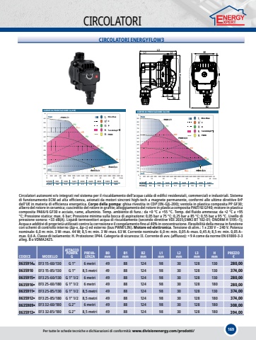 169CIRCOLATORICIRCOLATORI ENERGYFLOW3L3HL1B1GL2B0B21.02.03.04.05.06.001.52.53.54.55.5m0.50120016002000l/hl/min60010001400180022002400260028003000320001020304050200400800Min-MaxTacoAdapt%u2122CCICIICIIICICIICIIIP3P2P1PWMPWM III/3PWM II/2PWM I/1PPMin-MaxTacoAdapt%u2122CICICIICIIIIP3P2P1PWMPWM I/1%u2122CminCmaxQ [l/h]800 1200160020002400280032003600H [m]5.85.24.13.32.61.91.2 N/ACURVEDIPRESTAZIONE (6,0 M)m1.02.03.04.05.06.07.08.00.51.52.53.54.55.56.57.58.500120016002000l/hl/min60010001400180022002400260028000 3200 540030003200340036001060200400800Min-MaxminTacoAdapt%u2122CCICIICIIIP3P1P2P3P1PWMPWM III/3PWM II/2PWM I/1nWIMn-MaxTacoAdapt%u2122CCICIICIII3P1P2P3P3P1PWMPWM II/2PWM I/1%u2122CminCmaxQ [l/h]8001200 160020002400 2800 3200 3600H [m]8.4 7.56.2 5.14.23.4 2.61.8CURVEDIPRESTAZIONE (8,5 M)Circolatori autonomi e/o integrati nel sistema per il riscaldamento dell%u2019acqua calda di edifici residenziali, commerciali e industriali. Sistema di funzionamento ECM ad alta efficienza, azionati da motori sincroni high-tech a magnete permanente, conformi alle ultime direttive ErP dell%u2019UE in materia di efficienza energetica. Corpo della pompa: ghisa rivestita in CDP (EN-GJL-200); ventola in plastica composita PP GF30; albero del rotore in ceramica; cuscinetto del rotore in grafite; alloggiamento del rotore in plastica composita PA6T/6I GF40; motore in plastica composita PA66/6 GF30 e acciaio, rame, alluminio. Temp. ambiente di funz.: da +0 %u00b0C a +55 %u00b0C. Temp. del fluido ammessa: da +2 %u00b0C a +95 %u00b0C; Pressione statica: max. 6 bar; Pressione minima sulla bocca di aspirazione: 0,05 bar a 75 %u00b0C; 0,25 bar a 85 %u00b0C; 0,55 bar a 95 %u00b0C. Livello di pressione sonora: <33 dB(A). Liquidi termovettori acqua di riscaldamento (secondo direttive VDI 2035;SWKI BT 102-01; %u00d6NORM H 5195%u20131); Acqua e additivi di propriet%u00e0 utilizzati contro la corrosione e il congelamento fino al 40% in concentrazione. Flessibilit%u00e0 della messa in funzione con schemi di controllo interno (%u0394p-v, %u0394p-c) ed esterno (bus PWM/LIN). Motore ed elettronica. Tensione di alim.: 1 x 230 V %u2013 240 V. Potenza nominale: 6,0 m: min. 3 W%u2013max. 44 W; 8,5 m: min. 3 W%u2013max. 63 W. Corrente nominale: 6,0 m: min. 0,05 A%u2013max. 0,45 A; 8,5 m: min. 0,05 A%u2013max. 0,6 A. Classe di isolamento: H. Protezione: IP44. Categoria di sicurezza: II. Corrente di avv. (afflusso): < 9 A come da norme EN 61000-3-3 alleg. B o VDMA2425.CODICEMODELLOATTACCO POMPAGPREVA-LENZAB0mmB1mmB2mmL1mmL2mmL3mmHmmPREZZO%u20ac0635914%u25cfEF3 15-60/130G 1%u201d6 metri49881249830128130280,000635910EF3 15-85/130G 1%u201d8,5 metri49881249830128130374,000635915%u25cfEF3 25-60/130G 1%u201d 1/26 metri49881249830128130280,000635916%u25cfEF3 25-60/180G 1%u201d 1/26 metri49881249830128180280,000635911%u25cfEF3 25-85/130G 1%u201d 1/28,5 metri49881249830128130374,000635912%u25cfEF3 25-85/180G 1%u201d 1/28,5 metri49881249830128180374,000635909%u25cfEF3 32-60/180G 2%u201d6 metri49881249830128180308,000635913%u25cfEF3 32-85/180G 2%u201d8,5 metri49881249830128180394,00Per tutte le schede tecniche e dichiarazioni di conformit%u00e0: www.divisionenergy.com/prodotti/
