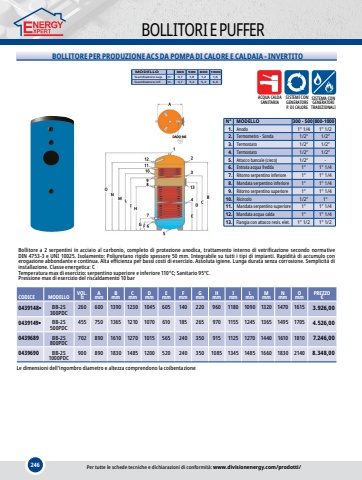 246BOLLITORI E PUFFERBOLLITORE PER PRODUZIONE ACS DA POMPA DI CALORE E CALDAIA - INVERTITOSISTEMI CON GENERATORE P. DI CALOREACQUA CALDA SANITARIASISTEMA CON GENERATORI TRADIZIONALIMODELLO3005008001000 Scambiatore sup. m20,71,01,21,6 Scambiatore inf. m23,75,25,26,0N%u00b0MODELLO300 - 500800-10001.Anodo 1%u201d 1/41%u201d 1/22.Termometro - Sonda1/2%u201d1/2%u201d3.Termostato 1/2%u201d1/2%u201d4.Termostato 1/2%u201d1/2%u201d5.Attacco bancale (cieco) 1/2%u201d-6.Entrata acqua fredda 1%u201d1%u201d 1/47.Ritorno serpentino inferiore 1%u201d1%u201d 1/48.Mandata serpentino inferiore 1%u201d1%u201d 1/49.Ritorno serpentino superiore 1%u201d1%u201d 1/410.Ricircolo 1/2%u201d1%u201d11.Mandata serpentino superiore1%u201d 1%u201d 1/412.Mandata acqua calda 1%u201d 1%u201d 1/4 13.Flangia con attacco resis. elet.1%u201d 1/21%u201d 1/2Bollitore a 2 serpentini in acciaio al carbonio, completo di protezione anodica, trattamento interno di vetrificazione secondo normative DIN 4753-3 e UNI 10025. Isolamento: Poliuretano rigido spessore 50 mm. Integrabile su tutti i tipi di impianti. Rapidit%u00e0 di accumulo con erogazione abbondante e continua. Alta efficienza per bassi costi di esercizio. Assoluta igiene. Lunga durata senza corrosione. Semplicit%u00e0 di installazione.Classe energetica: CTemperatura max di esercizio: serpentino superiore e inferiore 110%u00b0C; Sanitario 95%u00b0C.Pressione max di esercizio del riscaldamento 10 barCODICEMODELLOVOL.ltAmmBmmCmmDmmEmmFmmGmmHmmImmLmmMmmNmmOmmPREZZO%u20ac0439148%u25cfBB-2S 300PDC260600139012301045605140220960118010901320147016153.926,000439149%u25cfBB-2S 500PDC455750136512101070610185265970115512451365149517054.526,000439689BB-2S 800PDC702890161012701015565240350915112512701440161018107.246,000439690BB-2S 1000PDC9008901830148512005202403501085134514851660183021408.348,00Le dimensioni dell%u2019ingombro diametro e altezza comprendono la coibentazionePer tutte le schede tecniche e dichiarazioni di conformit%u00e0: www.divisionenergy.com/prodotti/