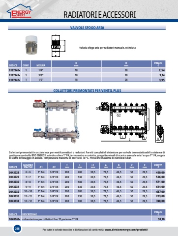 268RADIATORI E ACCESSORIVALVOLE SFOGO ARIADHValvola sfogo aria per radiatori manuale, nichelataCODICECONF.MISURADmmHmmPREZZO%u20ac0197340%u25cf11/4%u201d18282,540197341%u25cf13/8%u201d18283,140197342%u25cf11/2%u201d18283,95COLLETTORI PREMONTATI PER VENTIL PLUSEG1LCL1G2IABCollettori premontati in acciaio inox per ventilconvettori o radiatori. Forniti completi di detentore per valvole termostatizzabili o sistema di gestione e controllo BDD ENERGY, valvole a sfera 1%u201d1/4, termometro a contatto, gruppi terminali di scarico manuale aria/ acqua 1%u201d1/4, coppia di staffe di fissaggio in acciaio. Temperatura massima di esercizio: 70 %u00b0C. Pressione massima di esercizio: 6 bar.CODICENUMEROSTACCHIG1G2ImmLmmL1mmAmmBmmCmmEmmPREZZO%u20ac00430286 + 61%u201d 1/43/4%u201d EK20048639,579,546,55029,5490,0000430297 + 71%u201d 1/43/4%u201d EK20053639,579,546,55029,5526,0000430308 + 81%u201d 1/43/4%u201d EK20058639,579,546,55029,5571,0000430319 + 91%u201d 1/43/4%u201d EK20063639,579,546,55029,5614,00004303210 + 101%u201d 1/43/4%u201d EK20068639,579,546,55029,5657,00004303311 + 111%u201d 1/43/4%u201d EK20073639,579,546,55029,5703,00004303412 + 121%u201d 1/43/4%u201d EK20078639,579,546,55029,5748,00CODICEDESCRIZIONEPREZZO%u20ac0048069%u25cfcoibentazione per collettori fino 12 partenze 1%u201d1/458,10Per tutte le schede tecniche e dichiarazioni di conformit%u00e0: www.divisionenergy.com/prodotti/