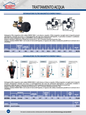 372TRATTAMENTO ACQUADEFANGATORE FILTRO MAGNETICO ENERGY MAG 1ADBCEIFHG 3/4%u201dG 3/4%u201dG 3/4%u201dG 3/4%u201dG 3/4%u201dG 3/4%u201dG 3/4%u201dDefangatore filtro magnetico sotto caldaia ENERGY MAG 1, con attacco a squadra. Il filtro magnetico raccoglie tutte le impurit%u00e0 presenti nell%u2019impianto, evitando cos%u00ec l%u2019usura e il danneggiamento del resto dei componenti dell%u2019impianto, in particolare circolatori e scambiatori. Materiali: corpo in poliammide, tappo in poliammide, cartuccia filtrante in acciaio inox;Magneti: Neodimio 11000 Gauss; Temperatura di esercizio: 0 - 90%u00b0C; Pressione massima di esercizio: 3 bar.Impiego: installare ENERGY MAG 1 sul circuito di ritorno dell%u2019impianto, in ingresso alla caldaia; installazione possibili sia in verticale che in orizzontale.CODICEATTACCHIPORTATA(DP=0,2 BAR)l/minCAPACIT%u00c0 FILTRANTE%u00b5mAmmBmmCmmDmmEmmFmmGmmHmmPREZZO%u20ac0125067%u25cf3/4%u201d9080092,464112185,497,7145,758,7151,7167,70DEFANGATORE FILTRO MAGNETICO ENERGY MAG 3SCHEMA 1SCHEMA 21 Defangatore orizzontale2 Radiatore impianto riscald.3 Generatore di calore4 Scarico SCHEMA 31 Defangatore orizzontale2 Radiatore impianto riscald.3 Generatore di calore4 Scarico143221 Defangatore verticale2 Radiatore impianto riscald.3 Generatore di calore4 Scarico 12234412234Defangatore filtro magnetico sotto caldaia ENERGY MAG 3, multi attacco, in linea e a squadra. Il filtro magnetico raccoglie tutte le impurit%u00e0 presenti nell%u2019impianto, evitando cos%u00ec l%u2019usura e il danneggiamento del resto dei componenti dell%u2019impianto, in particolare circolatori e scambiatori. Materiali: vaso in materiale termoplastico, testa in materiale termoplastico, cartuccia filtrante in acciaio inox;Magneti: Neodimio 11000 Gauss; Temperatura di esercizio: 0 - 90%u00b0C; Pressione massima di esercizio: 7 bar.Impiego: installare ENERGY MAG 3 sul circuito di ritorno dell%u2019impianto, in ingresso alla caldaia; installazione possibili sia in verticale che in orizzontale.CODICEMATERIALECAPACIT%u00c0 FILTRANTE%u00b5mATTACCHIPORTATA(DP=0,2 BAR)l/minAmmBmmPNTEMP. ACQUA MAX%u00b0CPREZZOTESTAVASOCARTUCCIA%u20ac0021998%u25cfTermoplTermoplInox5003/4%u201d3375135790113,20CODICEDESCRIZIONEPREZZO%u20ac0013537%u25cfvaso di ricambio29,51Per tutte le schede tecniche e dichiarazioni di conformit%u00e0: www.divisionenergy.com/prodotti/