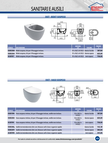 479SANITARI E AUSILIEKIT - BIDET SOSPESOCODICEDESCRIZIONEMISURAcmCOLOREPREZZO%u20ac0365200%u25cfBidet sospeso, kit per il fissaggio incluso.51 x 36,5 x H 29,5bianco lucido387,000365204%u25cfBidet sospeso, kit per il fissaggio incluso.51 x 36,5 x H 29,5bianco opaco625,000228767Bidet sospeso, kit per il fissaggio incluso.51 x 36,5 x H 29,5nero opaco736,00EKIT - VASO SOSPESOCODICEDESCRIZIONEMISURAcmCOLOREPREZZO%u20ac0365199%u25cfVasosospeso rimless, kit per il fissaggio incluso, sedile non incluso.52 x 36,5 x H 35,5bianco lucido387,000365203%u25cfVasosospeso rimless, kit per il fissaggio incluso, sedile non incluso.52 x 36,5 x H 35,5bianco opaco625,000228769Vasosospeso rimless, kit per il fissaggio incluso, sedile non incluso.52 x 36,5 x H 35,5nero opaco736,000365206%u25cfSedile termoindurente slim con chiusura soft-close e sgancio rapidobianco lucido142,300365207%u25cfSedile termoindurente slim con chiusura soft-close e sgancio rapidobianco opaco303,000228749%u25cfSedile termoindurente slim con chiusura soft-close e sgancio rapidonero opaco341,00Per tutte le schede tecniche e dichiarazioni di conformit%u00e0: www.divisionenergy.com/prodotti/